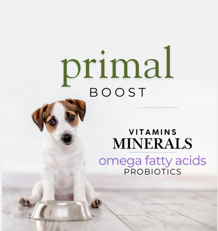 “Primal Boost is a holistic meal topper formulated for all life stages and breeds, to enhance both palatability and nutritional density of any canine diet. It provides natural sources of essential vitamins, minerals, fatty acids, glucosamine, and chondroitin, along with two targeted probiotic strains specifically selected to support the gastrointestinal microbiota of dogs. Free from synthetic additives or preservatives, Primal Boost is designed to promote optimal health, support joint integrity, and encourage improved food acceptance in selective eaters.”